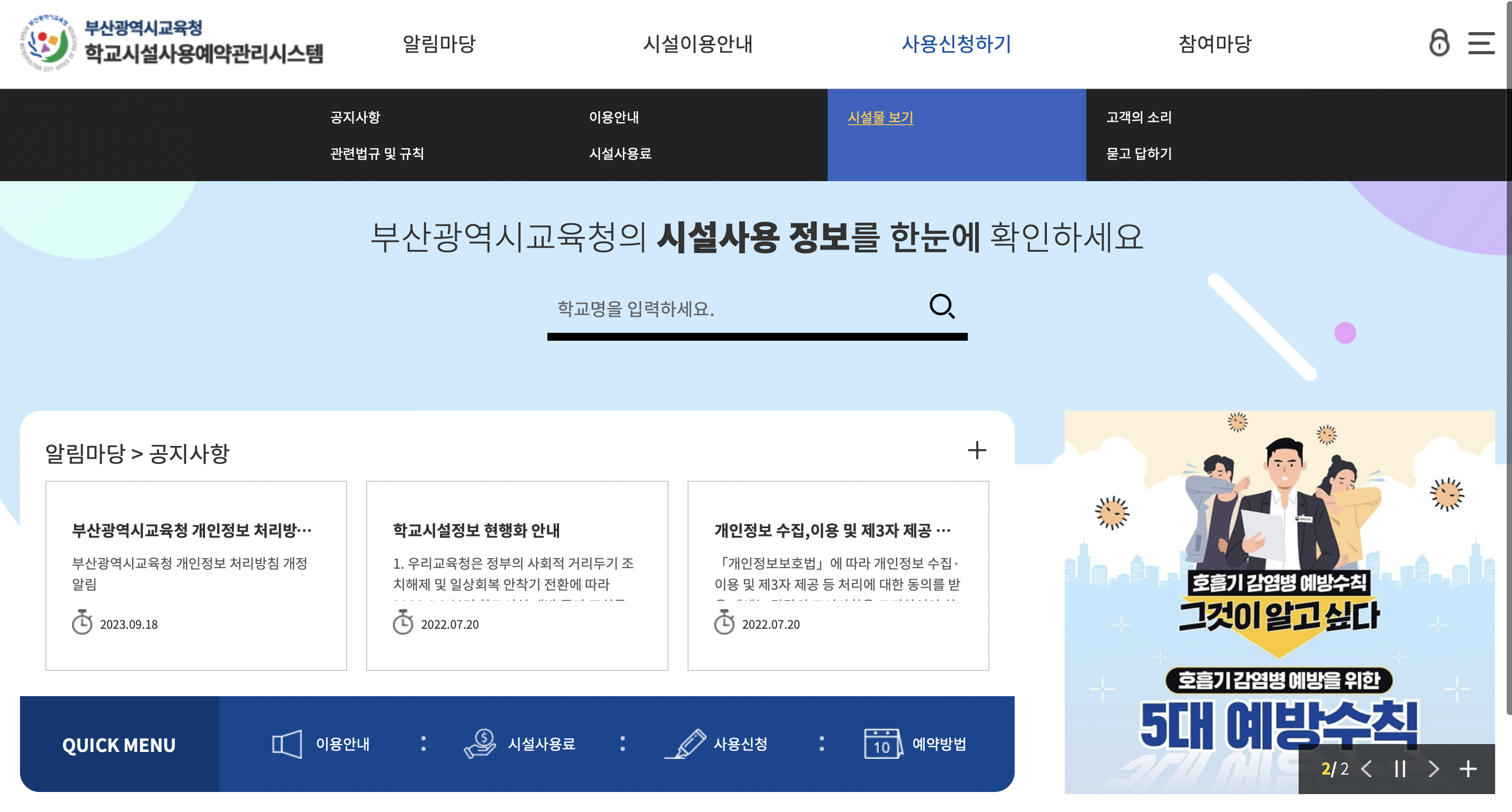 부산광역시교육청 학교시설사용예약관리 홈페이지에 오신 것을 환영합니다.