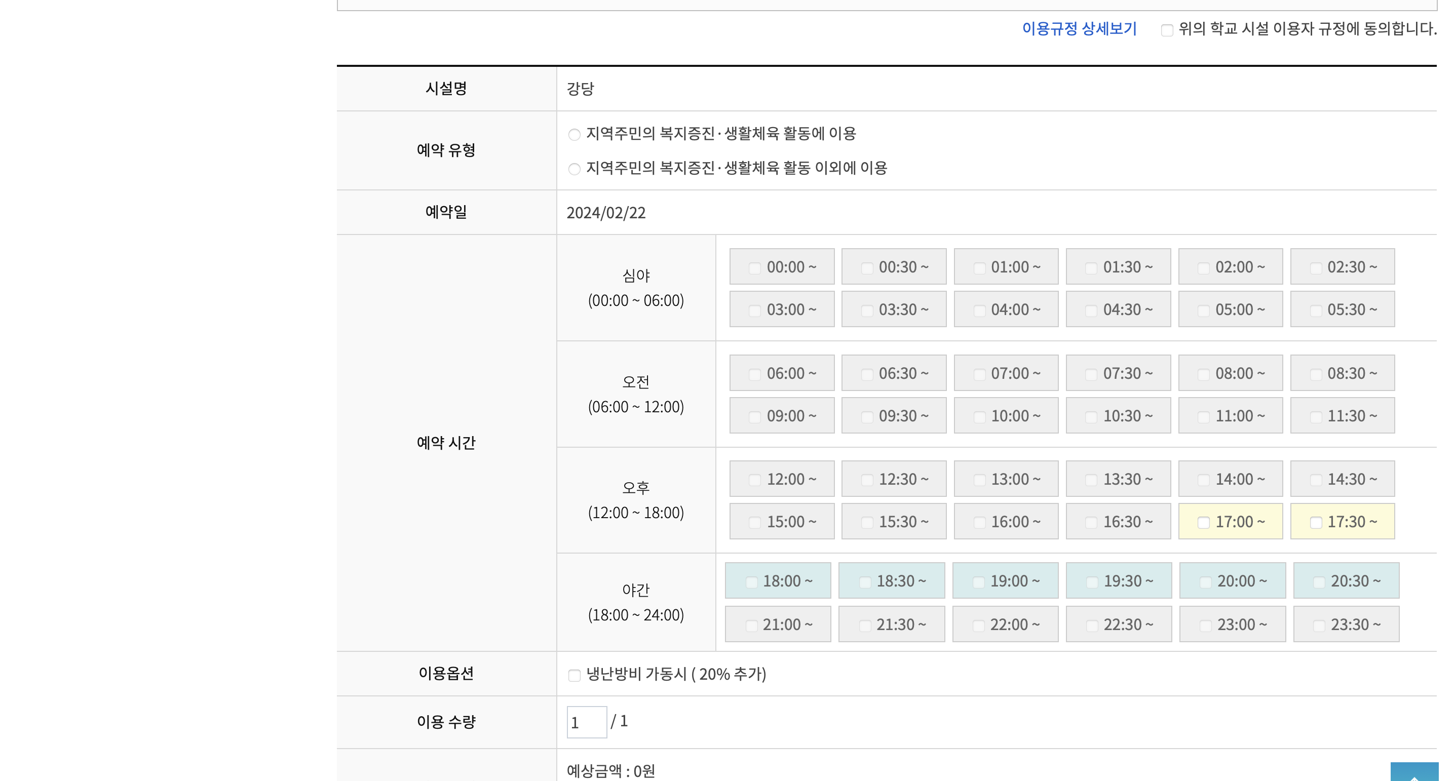 - 이용옵션: 냉난방기 가동시 체크( 이용시에는 시설 사용 요금의 20% 부과 )